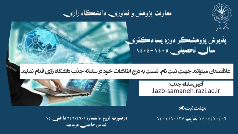 فراخوان پذیرش پژوهشگر پسادکتری دانشگاه رازی - نیم‌سال دوم سال تحصیلی 1405-1404 (دانشگاه‌ها)