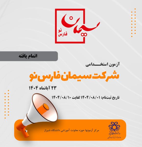 دانشگاه شیراز اقدام به برگزاری آزمون استخدامی جهت تکمیل نیروهای متخصص ( تعدادی نیروی حائز شرایط از طریق برگزاری آزمون کتبی و مصاحبه تخصصی، به صورت قراردادی )  برای شرکت سیمان فارس نو می‌نماید.
